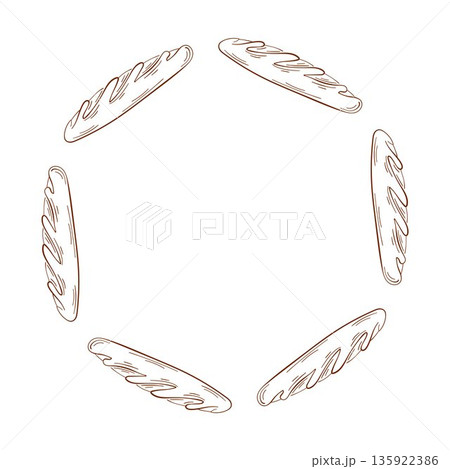 French baguette wreath in line art style. Loaf of bread card for bakery shop menu isolated on a white background.