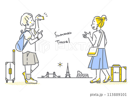 夏休みの海外旅行を楽しむ観光客の女性 シンプルでお洒落な線画イラスト