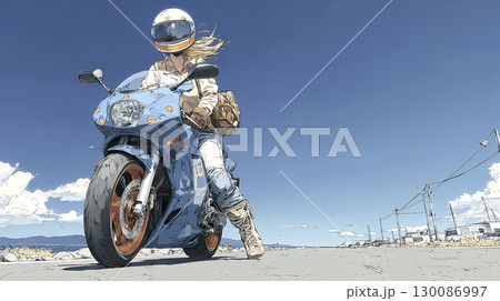 大型クルーザーバイクに乗る女性ライダーのイラスト素材