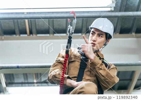 建設現場の足場に登って落下防止フックを確認する作業員
