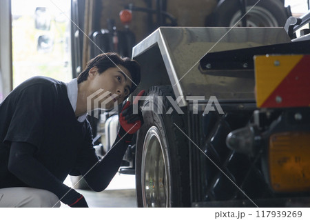 トラックを点検する男性