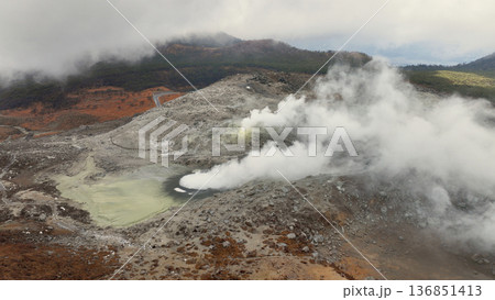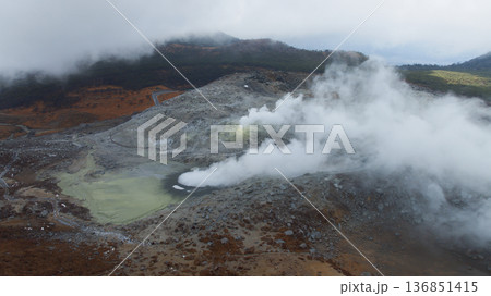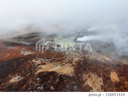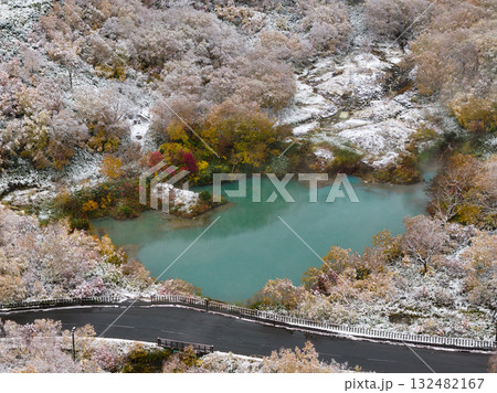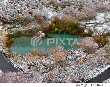 酸ヶ湯 初雪が積もった紅葉の地獄沼 青森県青森市(ドローンによる空撮)