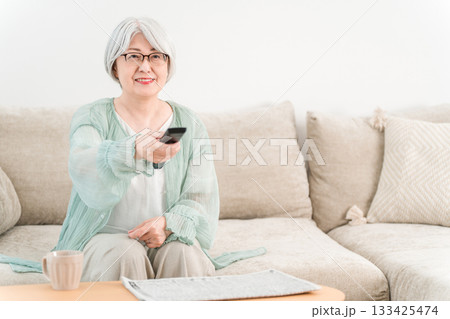 リビングのソファーに座りテレビのリモコンを操作するグレイヘアーのシニア女性
