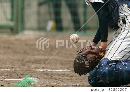 野球の試合中にピッチャーの投げた球を受けようとして体で球を止めるキャッチャー