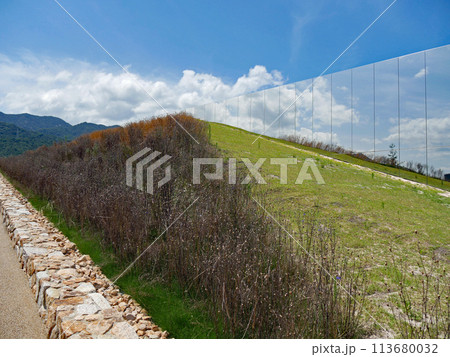 春の名古屋港ワイルドフラワーガーデン ブルーボネット 花々に囲まれた小川に架かる橋