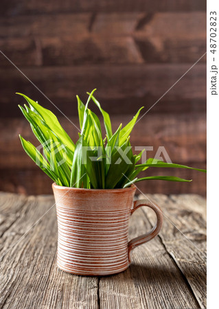 Fresh wild garlic leaves in a cup