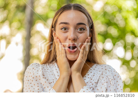 Woman looking surprised at camera with big open eyes, shocked by sudden victory good news wow win