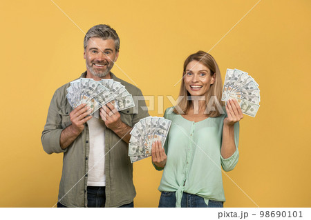 Big luck and win concept. Excited middle aged spouses holding a lot of dollar cash, celebrating success together