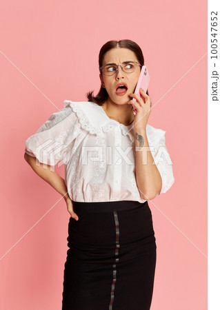 Portrait of young beautiful woman in formal wear posing, emotionally talking on mobile phone against pink studio background. Concept of business, emotions and education