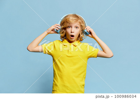 Little boy, child with shocked emotive face posing in headphones against blue studio background. Childhood and emotions