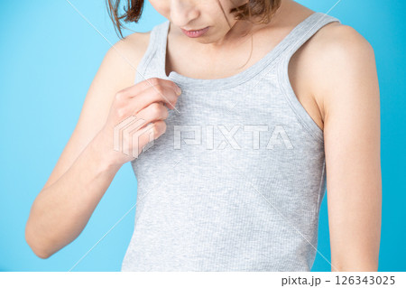 体臭を気にするタンクトップのミドル女性