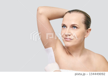 Caucasian female adult receiving underarm waxing treatment in spa salon