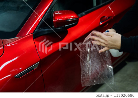 A technician sprays water before applying protective vinyl film to a car.