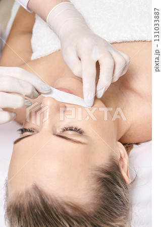 Caucasian female adult undergoing lip hair removal with wax strip by beautician