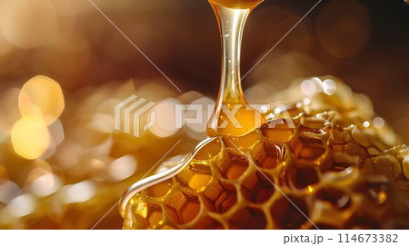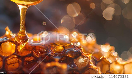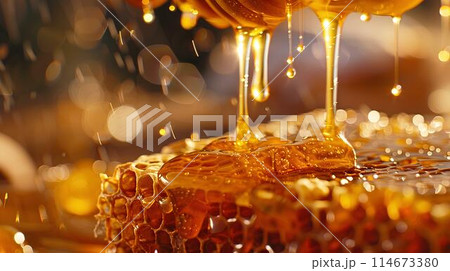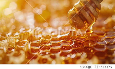 Honey dripping from the wooden honey dropper over thick golden honeycomb on a blurred background. A close up view of the natural organic sweet product.