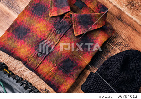 木製テーブルの上のフランネルシャツ