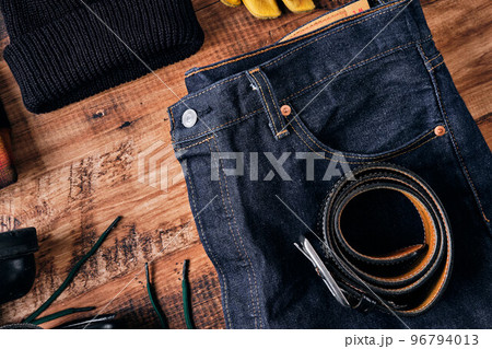 木製テーブルの上のジーンズ