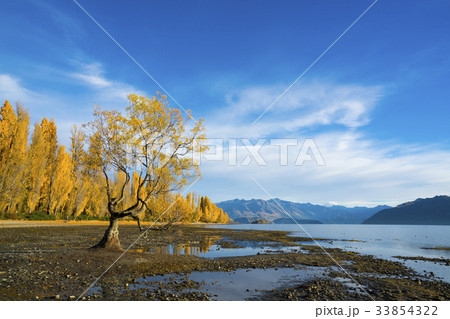 ニュージーランド 秋のオタゴ地方のワナカ湖の湖畔の紅葉で黄色に染まった木々