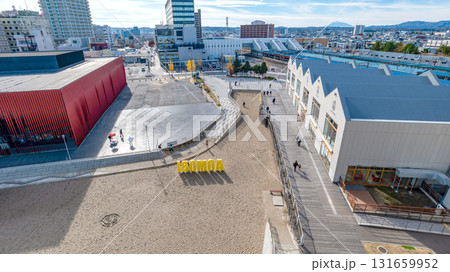 晴天の青い海公園から見る青森駅前ベイエリアの風景