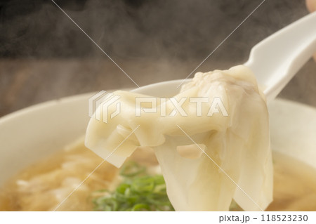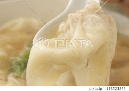 ワンタン ワンタンスープをレンゲで持ち上げる