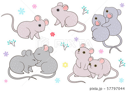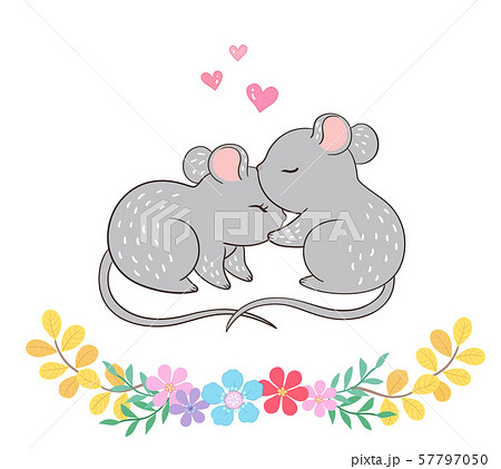2隻小老鼠,一隻親吻另一隻,下方有花朵