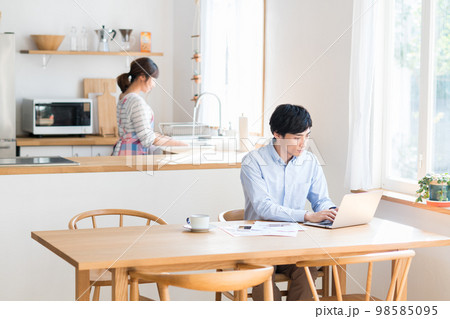 疲れた表情をしてため息をつく共働きの夫婦のイメージイラスト素材