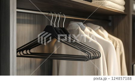 クローゼット内のスタイリッシュな黒いハンガー群
