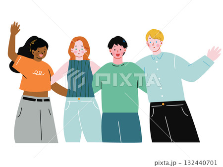 教科書を持って海外の友達と並ぶ留学生のイラスト