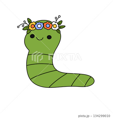 Cute happy cartoon worm with antennae sitting on a grassy patch with a flower