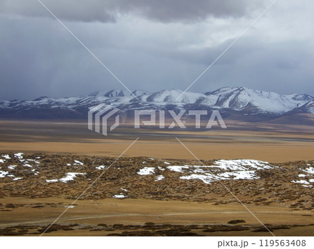 チベットの聖山・カイラス山を巡る起点の町・タルチェンから見る広大なチベット高原の風景とナムナニ峰