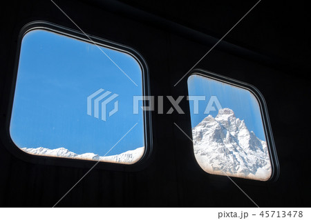 ブレイユ=チェルヴィナイア・ロープウェイ駅の窓越しに見たモンテ・チェルヴィーノ(マッターホルン)