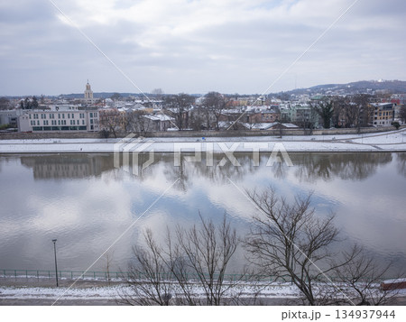 【ポーランド】クラクフのヴァヴェル城内から望む積雪の街並みと川の水面に反射した曇り空