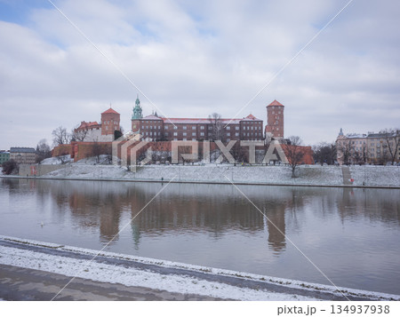 【ポーランド】クラクフ市街のヴァヴェル城と穏やかな河川と雪景色