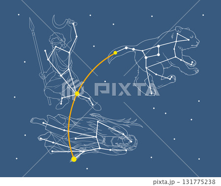 夜空に浮かぶ春の大曲線のイラスト(星座線)