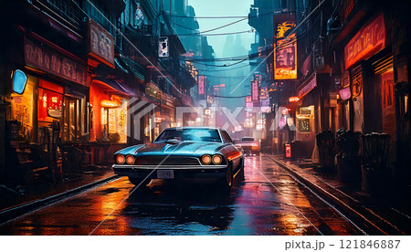 サイバーパンクの街並みに佇むレトロスポーツカー | ネオンライトと雨の夜景