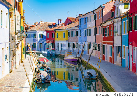 カラフルな建物に囲まれた街の水路 (イタリア、ブラーノ島)