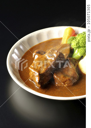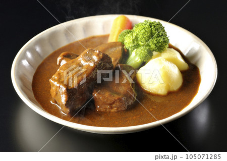 ブロッコリー、人参、ジャガイモが付け合わせてある厚切り牛タンのビーフシチューを黒背景で撮影
