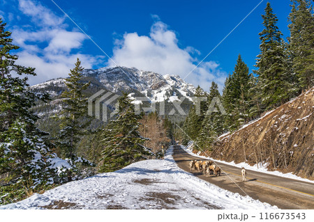 A group of young Bighorn Sheeps (ewe and lamb) on the snowy mountain road. Banff National Park in October, Mount Norquay Scenic Drive. Canadian Rockies, Canada.