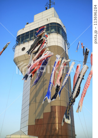五老スカイタワーと空を泳ぐ鯉のぼり