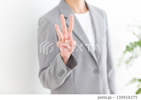 指を3本立てるグレーのスーツ姿のミドル女性ビジネスウーマン