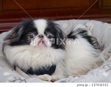 ベッドでくつろぐ可愛い狆(Japanese Chin)の室内ポートレート