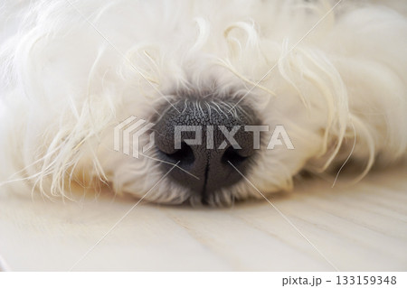 ビションフリーゼ子犬の黒い鼻アップとふわふわの白い毛