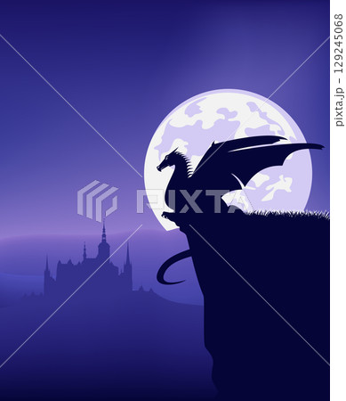 medieval fairy tale dragon and castle at night with full moon vector silhouette scene
