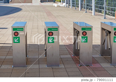 Entrance turnstile gate at swimming pool area on a sunny day.