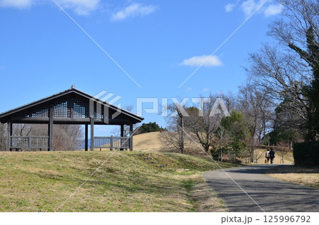 馬見丘陵公園(初夏 三角の東屋 日に輝く樹々)