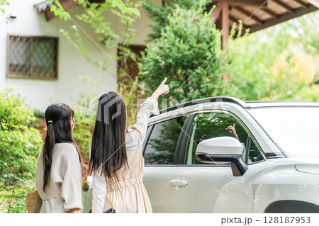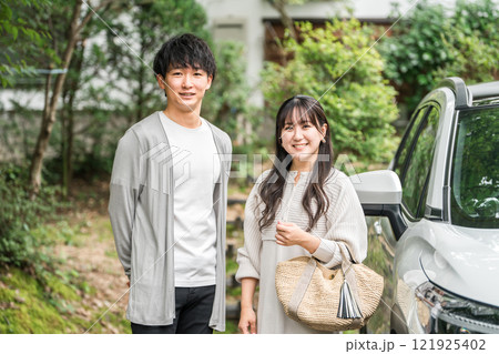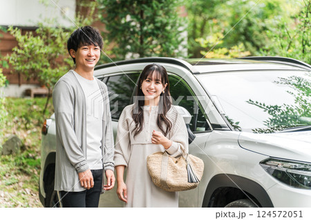 旅行でペンション・コテージに車でやってきたカップル・夫婦