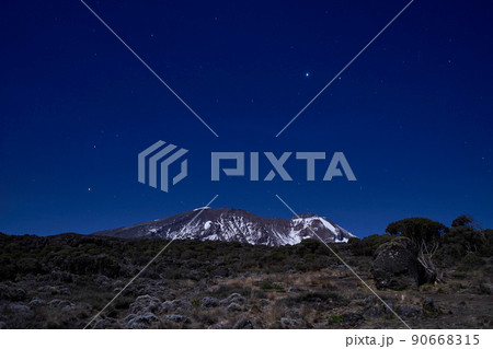 月明かりに照らされるキリマンジャロ、キボ峰(マチャメルート、シラーケイブキャンプ場)
