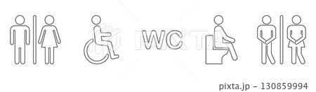 Restroom And Wc Sign Line Icon Set. Gender, Accessibility and Urgency Symbols Collection. Public Toilet, Male And Female, Wheelchair Accessible Icons. Editable Stroke. Isolated Vector Illustration
