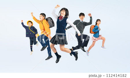 ジャンプする子供達のグループ 小中学生・幼稚園児