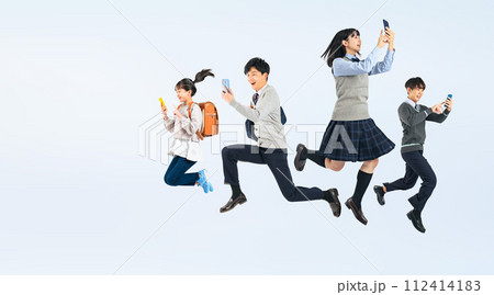 スマホを使いながらジャンプする学生のグループ